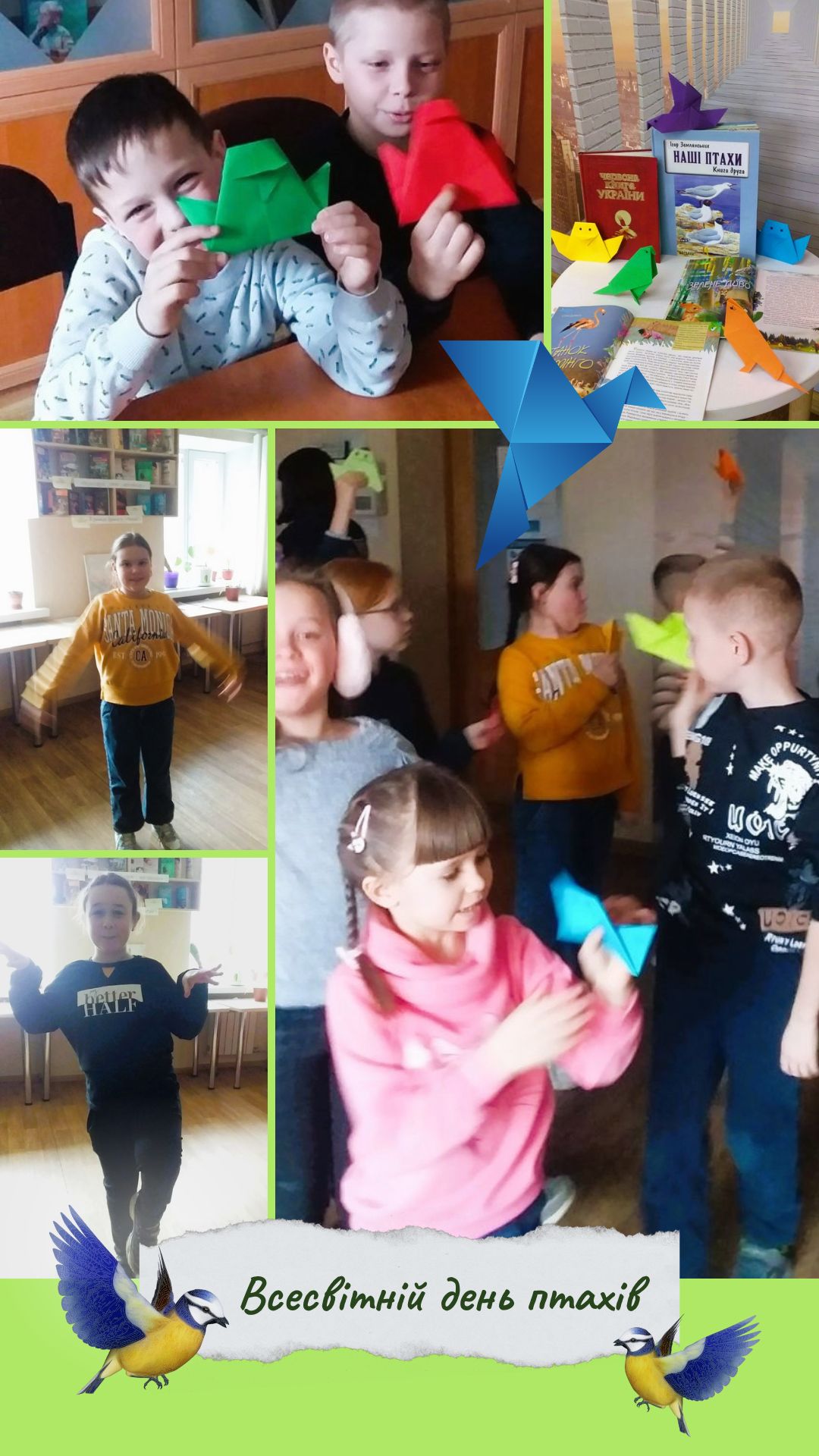 Разом із бібліотекарем дітлахи робили птаха-оріґамі. Усі роботи прикрасили книжкову виставку, присвячену Дню птахів. Також діти розважились грою-пантомімою “Політ птаха”, на якій треба було фантазувати, щоб зобразити качку, павича, чаплю, сову, зозулю та ін. Юні користувачі бібліотеки чудово провели час й поповнили скарбничку своїх знань про природу.