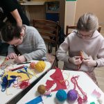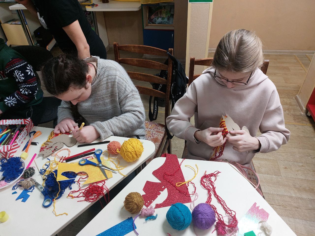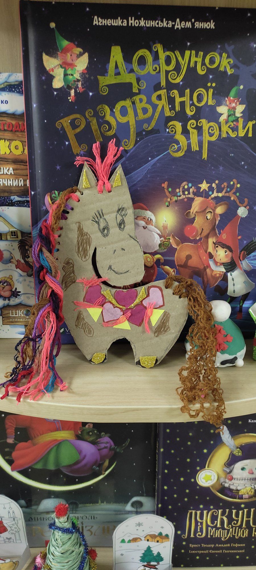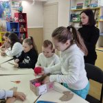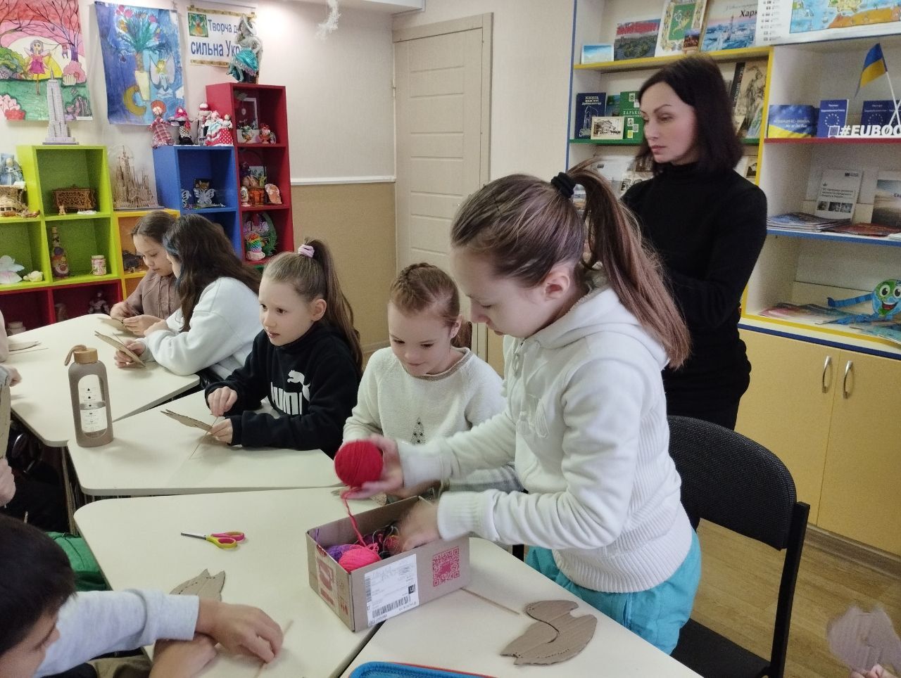 Юні читачі із захопленням працювали з тканиною, нитками та гофрокартоном, занурюючись у світ мистецтва й фантазії. У результаті з’явилися кумедні та оригінальні тваринки, прикрашені яскравими стразами й фоаміраном — символи українських традицій, тепла та домашнього затишку.